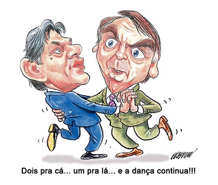 A chargem mostra os dois candidatos a presidência dançando, o que dar-se a entender que os dois estão tentando ver quem consegue a tão famosa cadeira para o poder. E nesse embalo da dança um conduzindo o outro em relação a quem comanda quem. As últimas notícias políticas , mostra uma disputa de fake news, de quem manipula mais as pessoas através das redes sociais. As diversas notícias que são forjadas e encaminhadas pela sociedade que as vezes não tem o conhecimento político e bagagem cognitiva para distinguir o que e fake news ou não , acaba escolhendo aceitar o que lhe é entregue a passa essas informações por meio de suas redes sociais e seus aplicativos de mensagens.