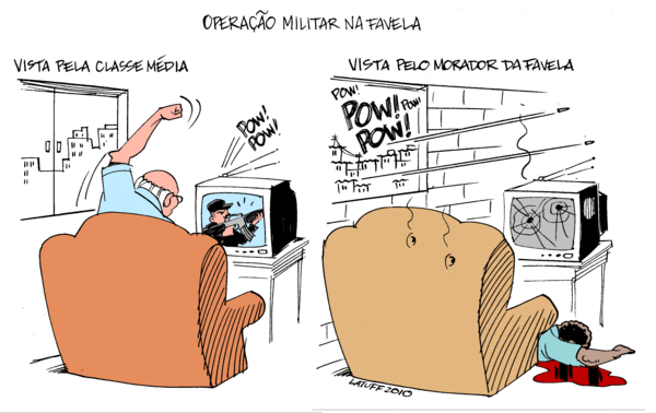 Analisando a imagem, podemos analisar como a mídia pode transformar a pessoa e todo o seu conceito de mundo de acordo com os seus desejos. Nessa charge mostra claramente como as vezes a mídia passa a imagem do negro de favela. Segundo o que vemos nas grandes redes de tv aberta, apresenta que nas favelas de todo Brasil existem somente negros, favelados e bandidos, ou seja, não existe outras pessoas que não seja, generalizando todas as pessoas que moram nas favelas. Temos que entender que o que não devemos aceitar somente o que é nos passado através da mídia, pois, nas favelas existem pessoas que não se enquadram nesses esteriótipos raciais e preconceituosos.